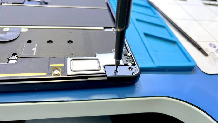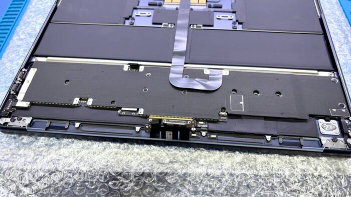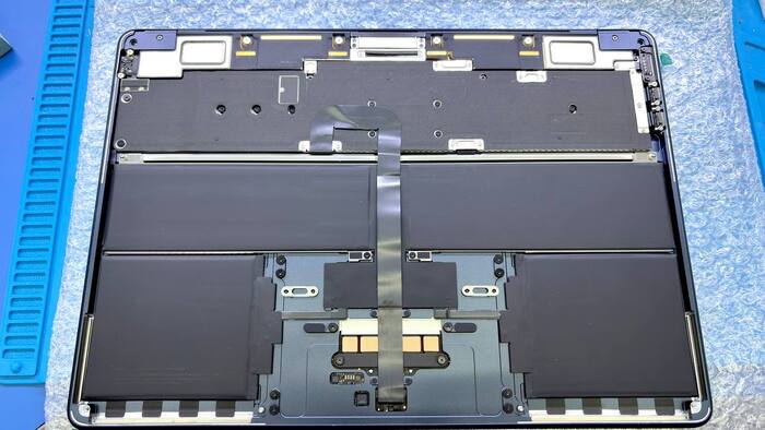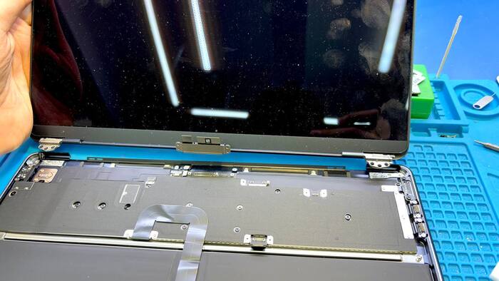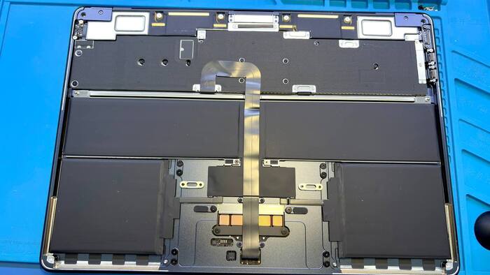 Сначала аккуратно снимаем заднюю крышку. Внутри — идеально выстроенный “мир Apple”: чистота, симметрия, тишина. Отключаем аккумулятор, отсоединяем шлейфы — чтобы, не дай бог, ничего не коротнуло. Далее отделяем матрицу от топкейса.