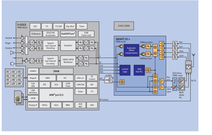Выше процессора находится чип Infineon PMB6258, которыйвыполняет задачи RF-фронтэнда или трансивера. Простыми словами, именно он ответственен за преобразование аналогового сигнала с антенны в цифровой пакет, который затем обрабатывает DSP в Baseband'е. Справедливо и обратное: когда Baseband подготовил GSM-пакет, он отсылает его в трансивер, а тот «пускает» его в эфир!