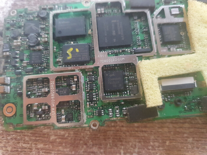 Чуть правее расположилась так называемая eMCP-микросхема Spansion S71PL032JA0, которая в одном корпусе содержит как оперативную, так и флэш-память, позволяя значительно сэкономить место на плате. Объём памяти скромный — 2МБ PSRAM и 4МБ NOR-памяти. Классика!
