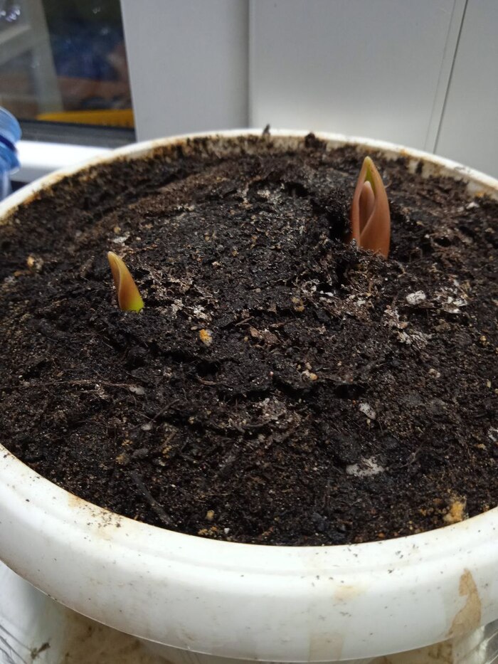 Оптимально +2....+4 градуса (мой холодильник позволяет регулировать температуру внутри). +5..+7 - уже много. То есть, в дверце хранить нельзя. Если температура хранения выше +4 градусов, то луковицы могут проснуться в холодильнике раньше времени. Это чревато слишком коротким стеблем у будущих тюльпанов (проверяла, у меня так в прошлом году получилось).Спустя 3-4 месяца со дня закладки тюльпанов в холодильник луковицы можно будет посадить в землю. Через несколько дней появятся ростки: