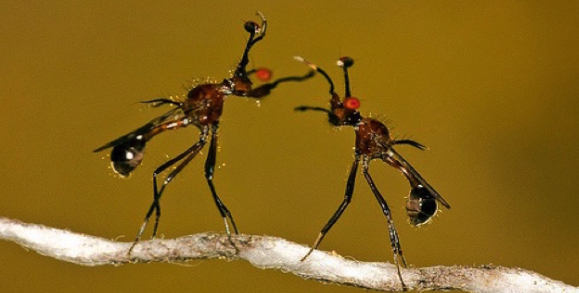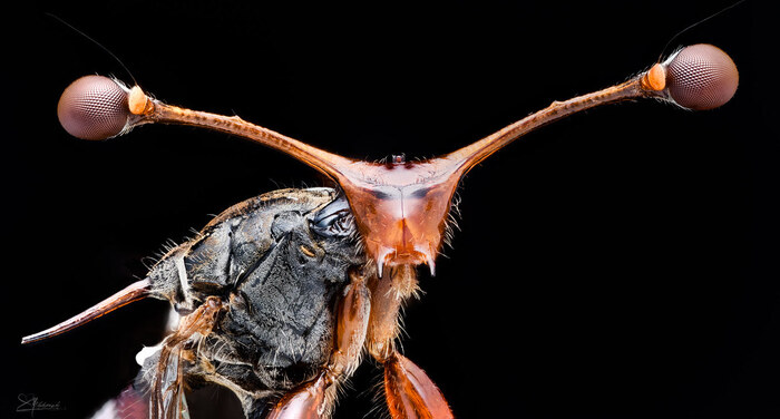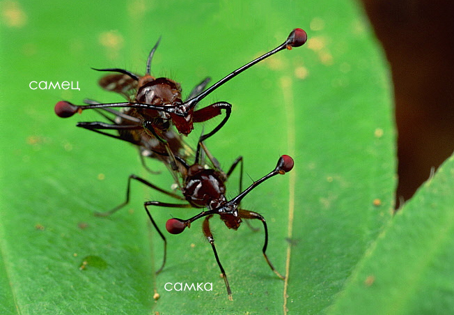 Нет ощущения, что это персонаж из «Звёздных войн»? У меня вот есть. Но нет, мухи вполне себе родные, земные, из тропических лесов Юго-Восточной Азии да Южной Африки. А то, что странные такие, так тому имеется веская причина. Да ещё какая! Стремление понравиться противоположному полу. Чем дальше в стороны разведены глаза – тем ты привлекательнее в мире стебельчатоглазых мух. Впрочем, половой диморфизм у них всё же есть, и стебельки у самок будут покороче, чем у самцов. Сейчас разберёмся почему.