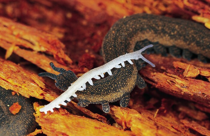 Но есть среди онихофор ещё более продвинутые виды, и живорождение у них самое что ни есть настоящее: у самок есть матка, в которой образуется плацента, питающая малышей от 4 до 13 месяцев. В этом случае они появляются на свет ещё более крупными и полностью сформированными – вот только у некоторых видов лишены пигмента.