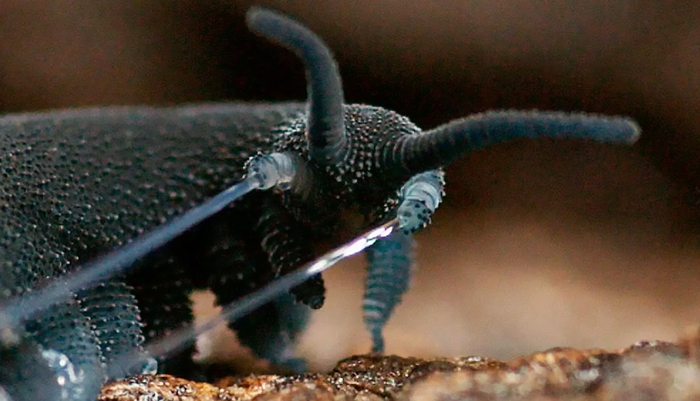 Но ребятки – хищники, и есть-то хочется. А высыхать – не хочется. Поэтому даже в благоприятный период года днём они не покидают своих сырых укрытий, а на охоту выходят ночью или во время дождя, поедая насекомых, пауков и других мелких беспозвоночных. Способ охоты у онихофор очень своеобразный: чтобы обездвижить добычу, они выбрасывают клейкую слизь из специальных желёз, расположенных по бокам рта, поражая цель на расстоянии до метра.